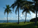 En route, nous essuyons un bon grain qui nous oblige à nous abriter quelques temps. Arrivée vers 7h30 à l’aéroport mais celui n’ouvre qu’à 8h. Nous décidons d’aller boire un verre en attendant. 8 heures, Bruno s’occupe de la "Clearence", des formalités de douanes et nous repartons vers Chatham Bay mais cette fois ci en mini-taxi. Le taxi nous laisse sur les hauteurs et redescendons le sentier vers la plage. Super balade.
