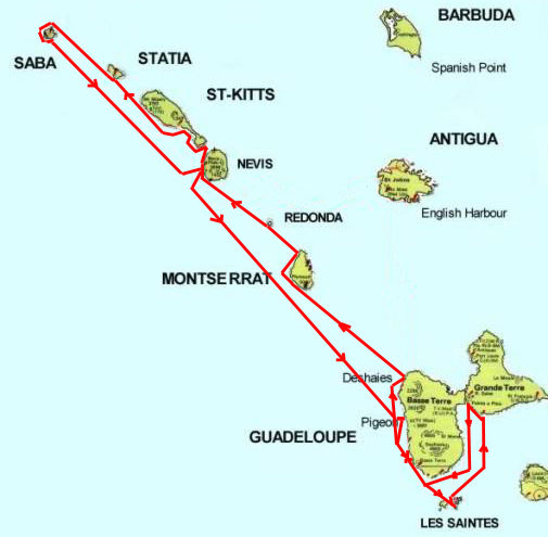Après Basse-Terre, on longe le bourg de Vieux-Habitants à 15 h 30 puis un appel radio envoyé par le CROSS AG (Centre Régional Opérationnel de Surveillance et de Sauvetage Antilles Guyane), nous signale un navire en détresse au large de Pointe-Noire.