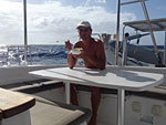 A leur retour, c’est tout bon. Il a rendez-vous à 9 h 30 pour une plongée en compagnie de Bruno et de l’examinateur. En attendant, l’élève Jojo révise un peu à l’aide du matériel à bord et de la documentation ramenée du club ainsi qu’au son de "Watusi".
