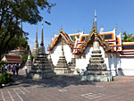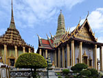 Parmi eux et l’un à côté de l’autre, il y a tout d’abord le "Prasat Phra Thep Bidon", le panthéon royal gardé par deux stupas dorés puis le "Phra Mondop", la bibliothèque sacrée fermée au public, conservant les manuscrits sacrés du bouddhisme et enfin le "Phra Si Ratana", le grand stupa doré.